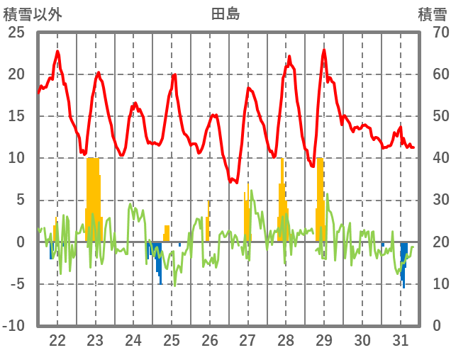 | 日 | 時 | 気温 | 降水 | 風向/風速 | 日照 | 積雪 | 降雪 |