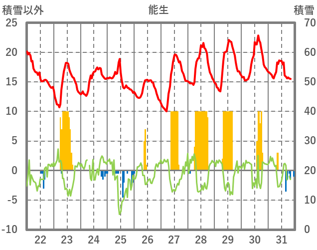 | 日 | 時 | 気温 | 降水 | 風向/風速 | 日照 | 積雪 | 降雪 |