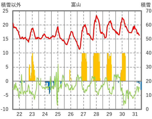 | 日 | 時 | 気温 | 降水 | 風向/風速 | 日照 | 積雪 | 降雪 |