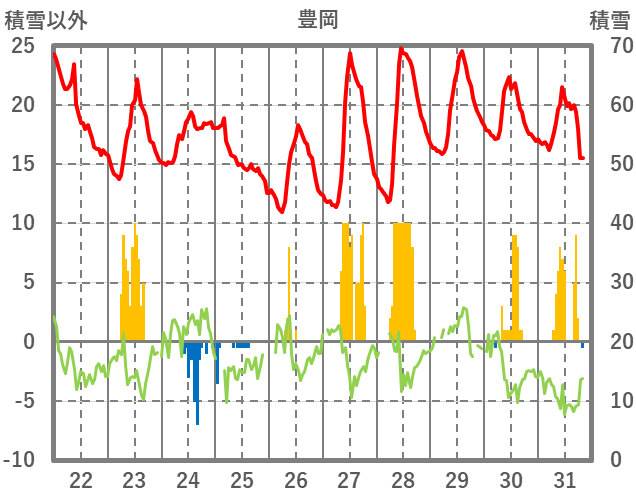 | 日 | 時 | 気温 | 降水 | 風向/風速 | 日照 | 積雪 | 降雪 |