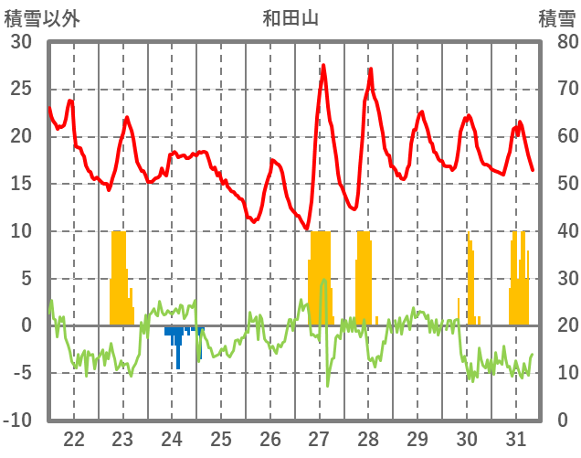 | 日 | 時 | 気温 | 降水 | 風向/風速 | 日照 | 積雪 | 降雪 |