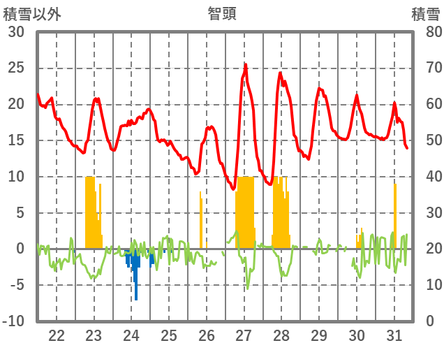 | 日 | 時 | 気温 | 降水 | 風向/風速 | 日照 | 積雪 | 降雪 |