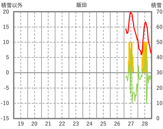 | 日 | 時 | 気温 | 降水 | 風向/風速 | 日照 | 積雪 | 降雪 |