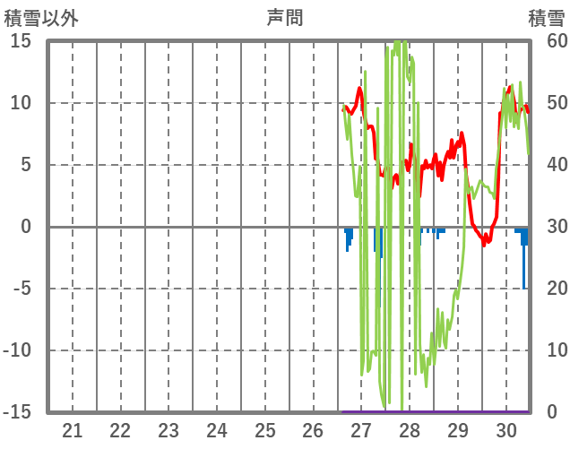 | 日 | 時 | 気温 | 降水 | 風向/風速 | 日照 | 積雪 | 降雪 |