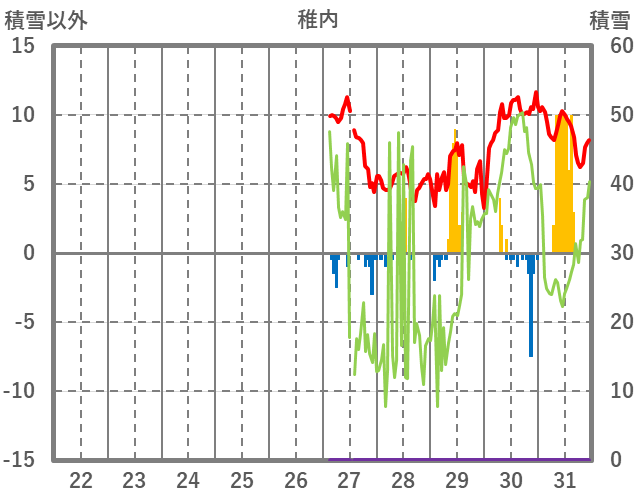 | 日 | 時 | 気温 | 降水 | 風向/風速 | 日照 | 積雪 | 降雪 |