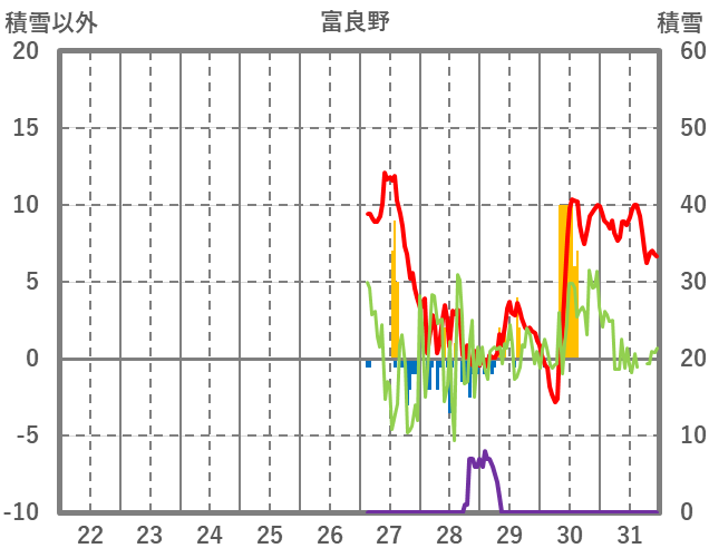 | 日 | 時 | 気温 | 降水 | 風向/風速 | 日照 | 積雪 | 降雪 |