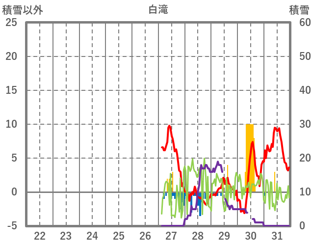 | 日 | 時 | 気温 | 降水 | 風向/風速 | 日照 | 積雪 | 降雪 |