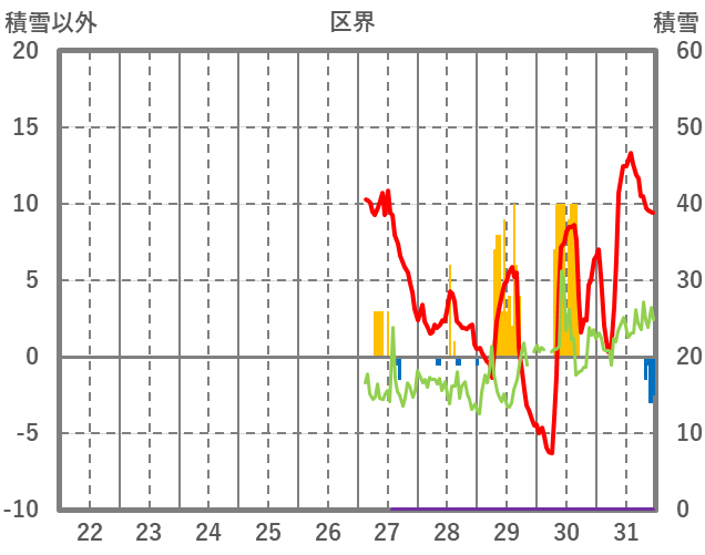 | 日 | 時 | 気温 | 降水 | 風向/風速 | 日照 | 積雪 | 降雪 |