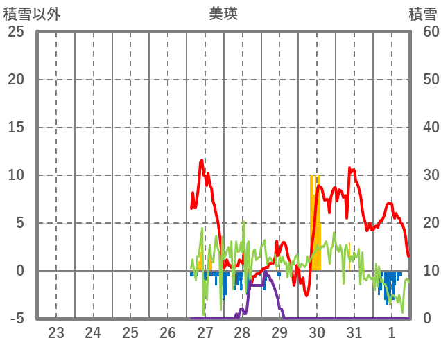 | 日 | 時 | 気温 | 降水 | 風向/風速 | 日照 | 積雪 | 降雪 |