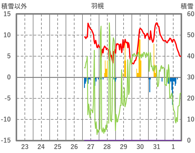 | 日 | 時 | 気温 | 降水 | 風向/風速 | 日照 | 積雪 | 降雪 |