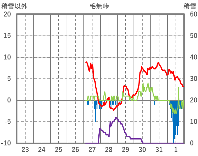 | 日 | 時 | 気温 | 降水 | 風向/風速 | 日照 | 積雪 | 降雪 |
