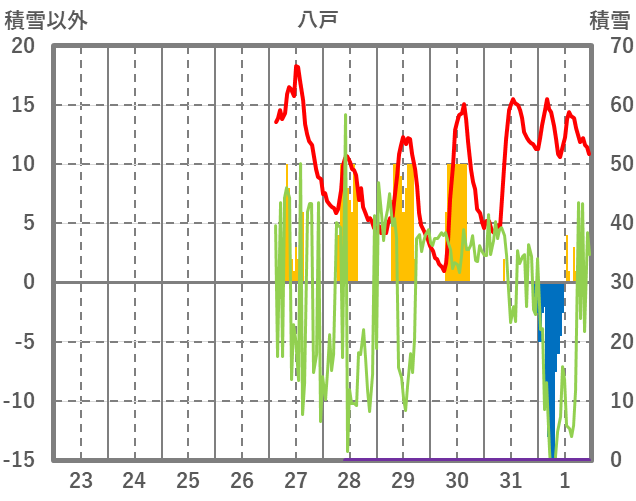 | 日 | 時 | 気温 | 降水 | 風向/風速 | 日照 | 積雪 | 降雪 |