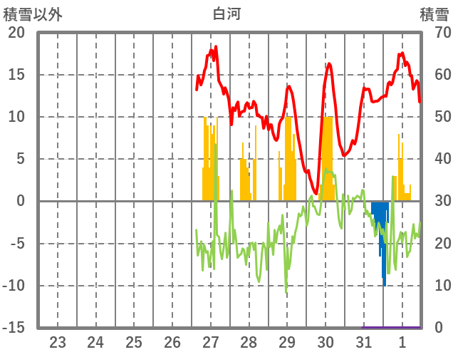 | 日 | 時 | 気温 | 降水 | 風向/風速 | 日照 | 積雪 | 降雪 |