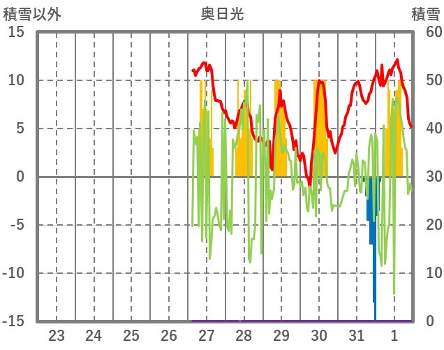 | 日 | 時 | 気温 | 降水 | 風向/風速 | 日照 | 積雪 | 降雪 |