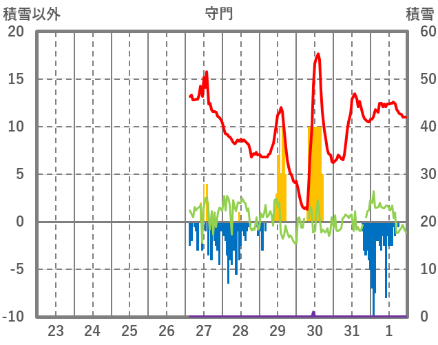 | 日 | 時 | 気温 | 降水 | 風向/風速 | 日照 | 積雪 | 降雪 |