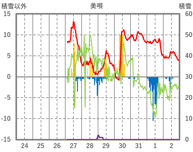 | 日 | 時 | 気温 | 降水 | 風向/風速 | 日照 | 積雪 | 降雪 |