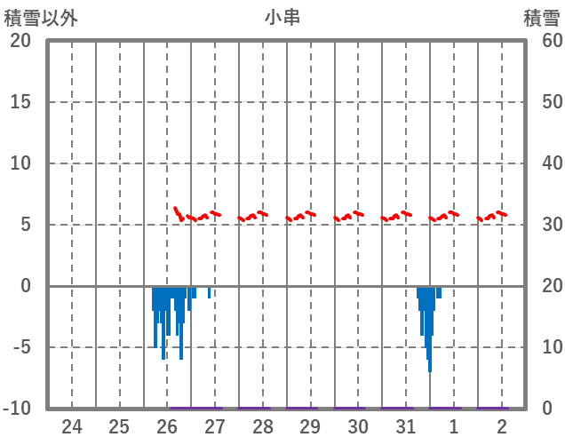 | 日 | 時 | 気温 | 降水 | 風向/風速 | 日照 | 積雪 | 降雪 |