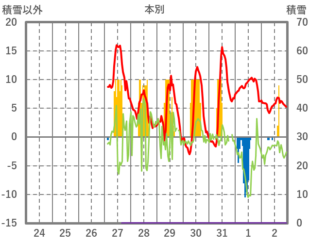 | 日 | 時 | 気温 | 降水 | 風向/風速 | 日照 | 積雪 | 降雪 |