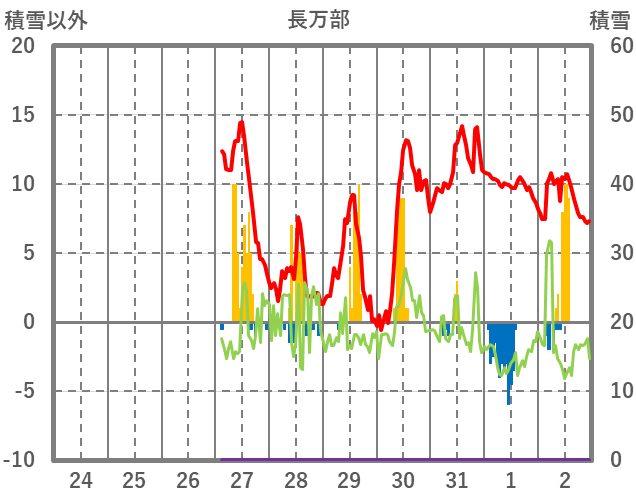 | 日 | 時 | 気温 | 降水 | 風向/風速 | 日照 | 積雪 | 降雪 |