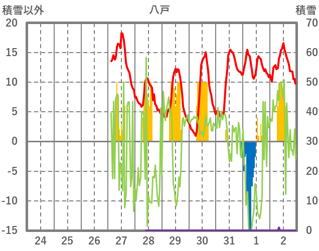 | 日 | 時 | 気温 | 降水 | 風向/風速 | 日照 | 積雪 | 降雪 |