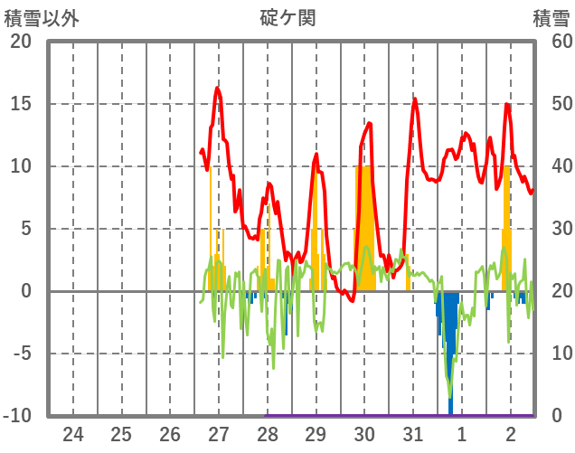 | 日 | 時 | 気温 | 降水 | 風向/風速 | 日照 | 積雪 | 降雪 |