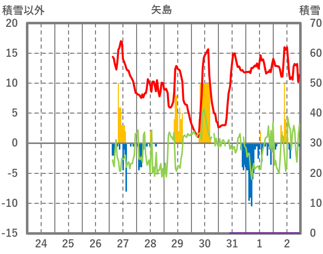 | 日 | 時 | 気温 | 降水 | 風向/風速 | 日照 | 積雪 | 降雪 |