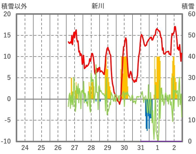 | 日 | 時 | 気温 | 降水 | 風向/風速 | 日照 | 積雪 | 降雪 |