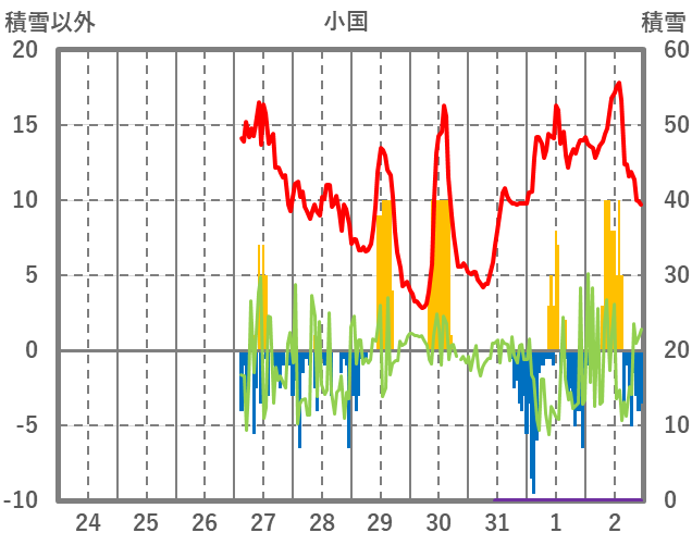 | 日 | 時 | 気温 | 降水 | 風向/風速 | 日照 | 積雪 | 降雪 |