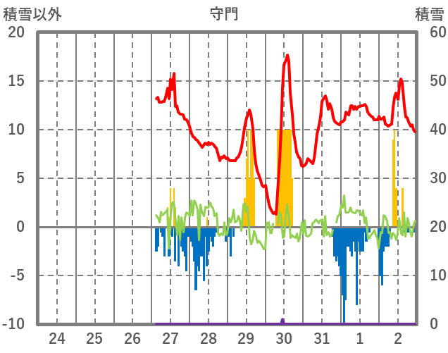 | 日 | 時 | 気温 | 降水 | 風向/風速 | 日照 | 積雪 | 降雪 |