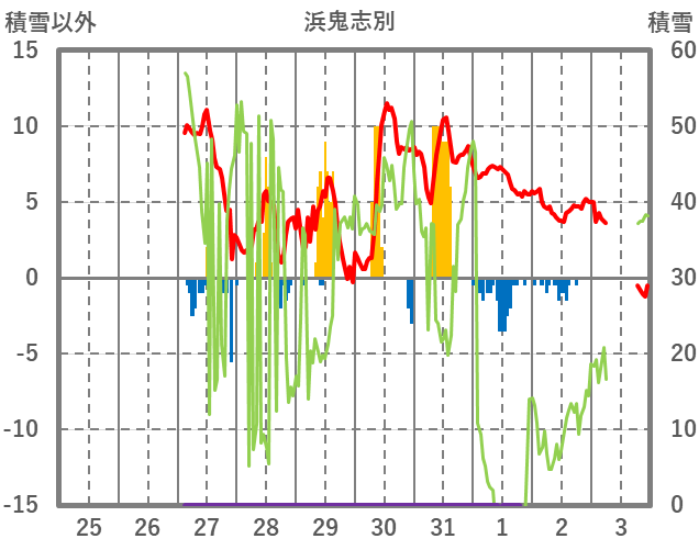 | 日 | 時 | 気温 | 降水 | 風向/風速 | 日照 | 積雪 | 降雪 |