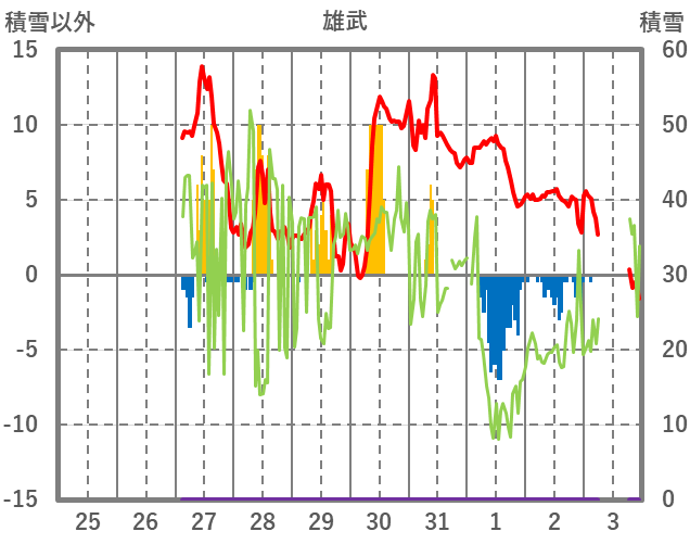| 日 | 時 | 気温 | 降水 | 風向/風速 | 日照 | 積雪 | 降雪 |