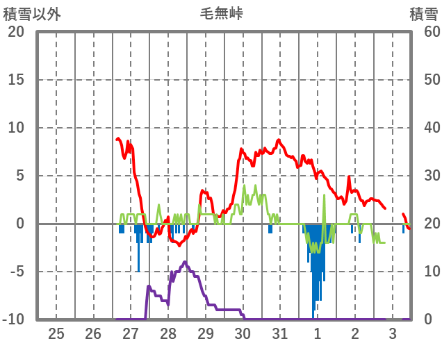 | 日 | 時 | 気温 | 降水 | 風向/風速 | 日照 | 積雪 | 降雪 |