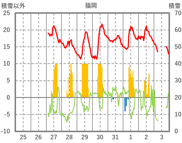 | 日 | 時 | 気温 | 降水 | 風向/風速 | 日照 | 積雪 | 降雪 |