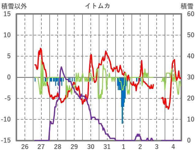| 日 | 時 | 気温 | 降水 | 風向/風速 | 日照 | 積雪 | 降雪 |