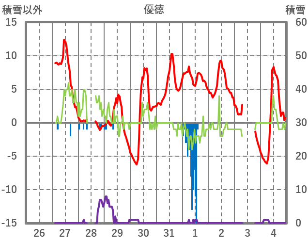 | 日 | 時 | 気温 | 降水 | 風向/風速 | 日照 | 積雪 | 降雪 |