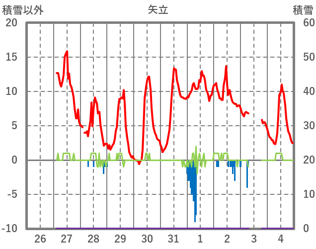 | 日 | 時 | 気温 | 降水 | 風向/風速 | 日照 | 積雪 | 降雪 |