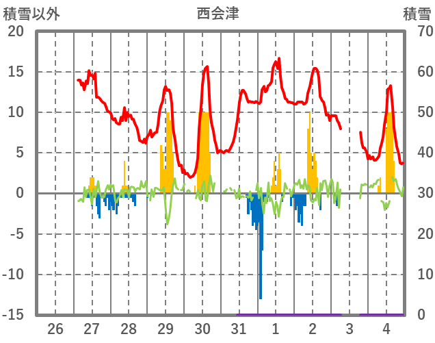 | 日 | 時 | 気温 | 降水 | 風向/風速 | 日照 | 積雪 | 降雪 |