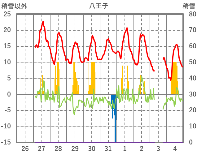 | 日 | 時 | 気温 | 降水 | 風向/風速 | 日照 | 積雪 | 降雪 |