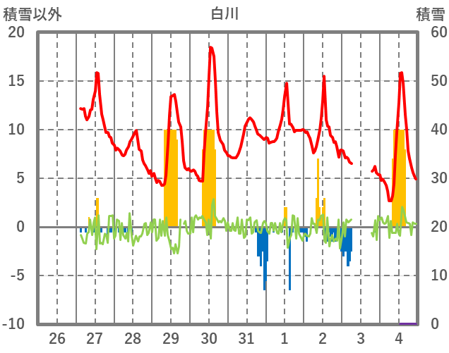 | 日 | 時 | 気温 | 降水 | 風向/風速 | 日照 | 積雪 | 降雪 |