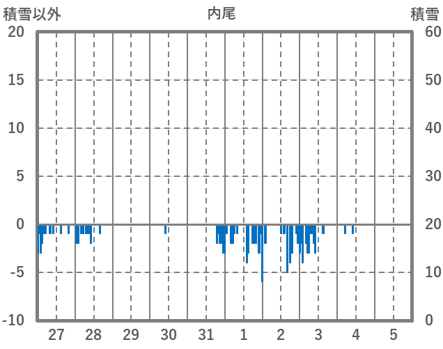 | 日 | 時 | 気温 | 降水 | 風向/風速 | 日照 | 積雪 | 降雪 |