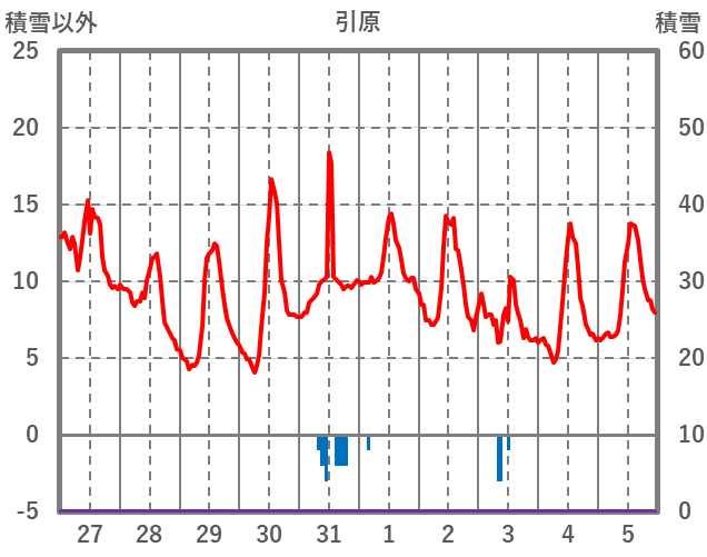 | 日 | 時 | 気温 | 降水 | 風向/風速 | 日照 | 積雪 | 降雪 |