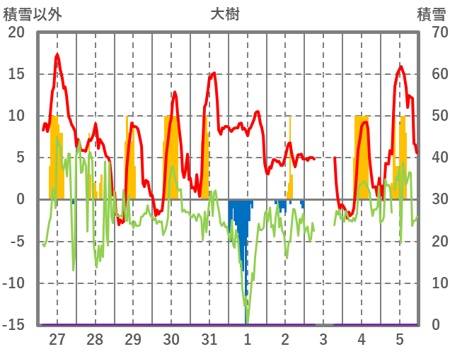 | 日 | 時 | 気温 | 降水 | 風向/風速 | 日照 | 積雪 | 降雪 |