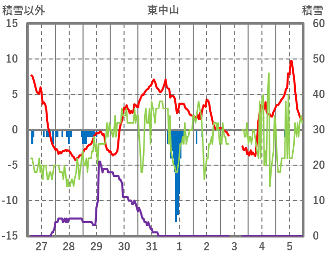 | 日 | 時 | 気温 | 降水 | 風向/風速 | 日照 | 積雪 | 降雪 |