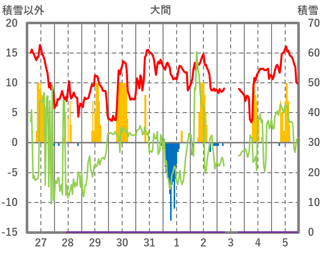 | 日 | 時 | 気温 | 降水 | 風向/風速 | 日照 | 積雪 | 降雪 |
