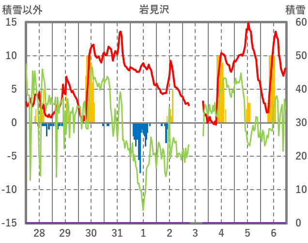 | 日 | 時 | 気温 | 降水 | 風向/風速 | 日照 | 積雪 | 降雪 |