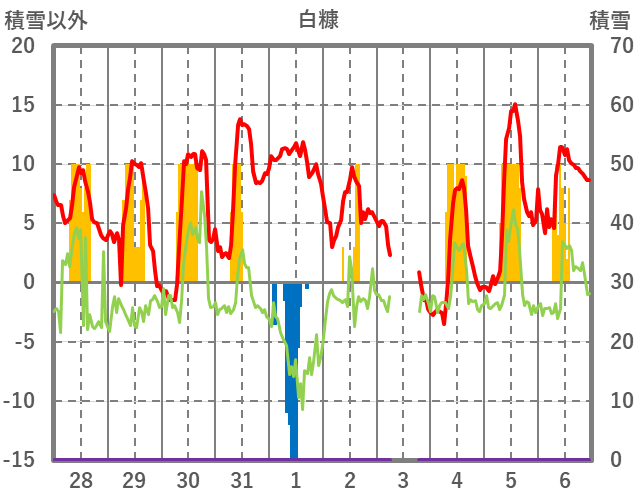 | 日 | 時 | 気温 | 降水 | 風向/風速 | 日照 | 積雪 | 降雪 |