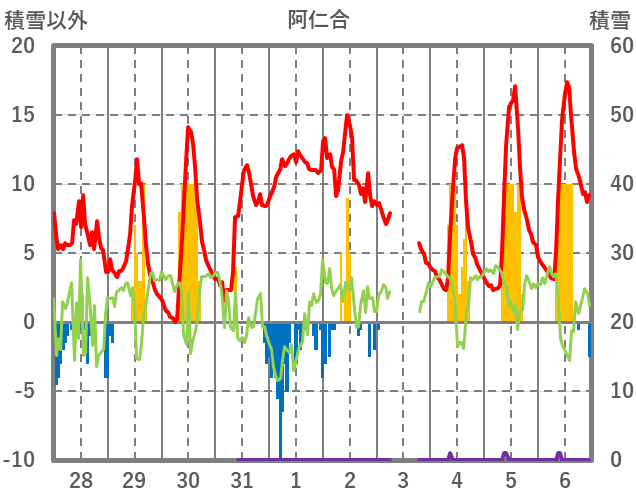 | 日 | 時 | 気温 | 降水 | 風向/風速 | 日照 | 積雪 | 降雪 |