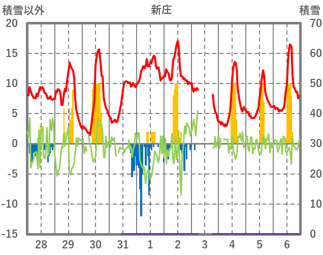 | 日 | 時 | 気温 | 降水 | 風向/風速 | 日照 | 積雪 | 降雪 |
