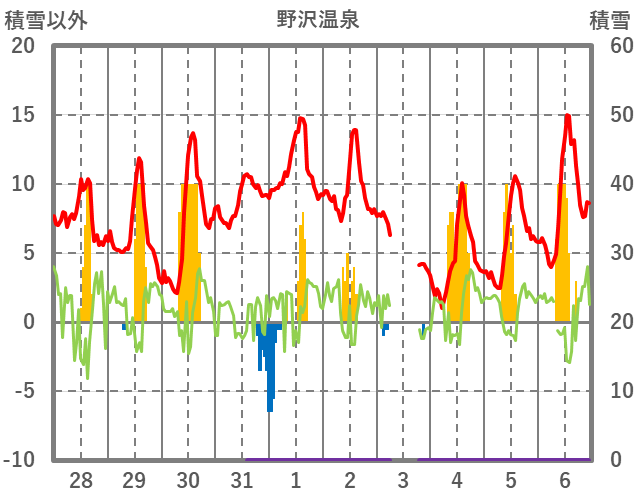 | 日 | 時 | 気温 | 降水 | 風向/風速 | 日照 | 積雪 | 降雪 |
