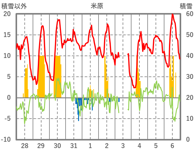 | 日 | 時 | 気温 | 降水 | 風向/風速 | 日照 | 積雪 | 降雪 |